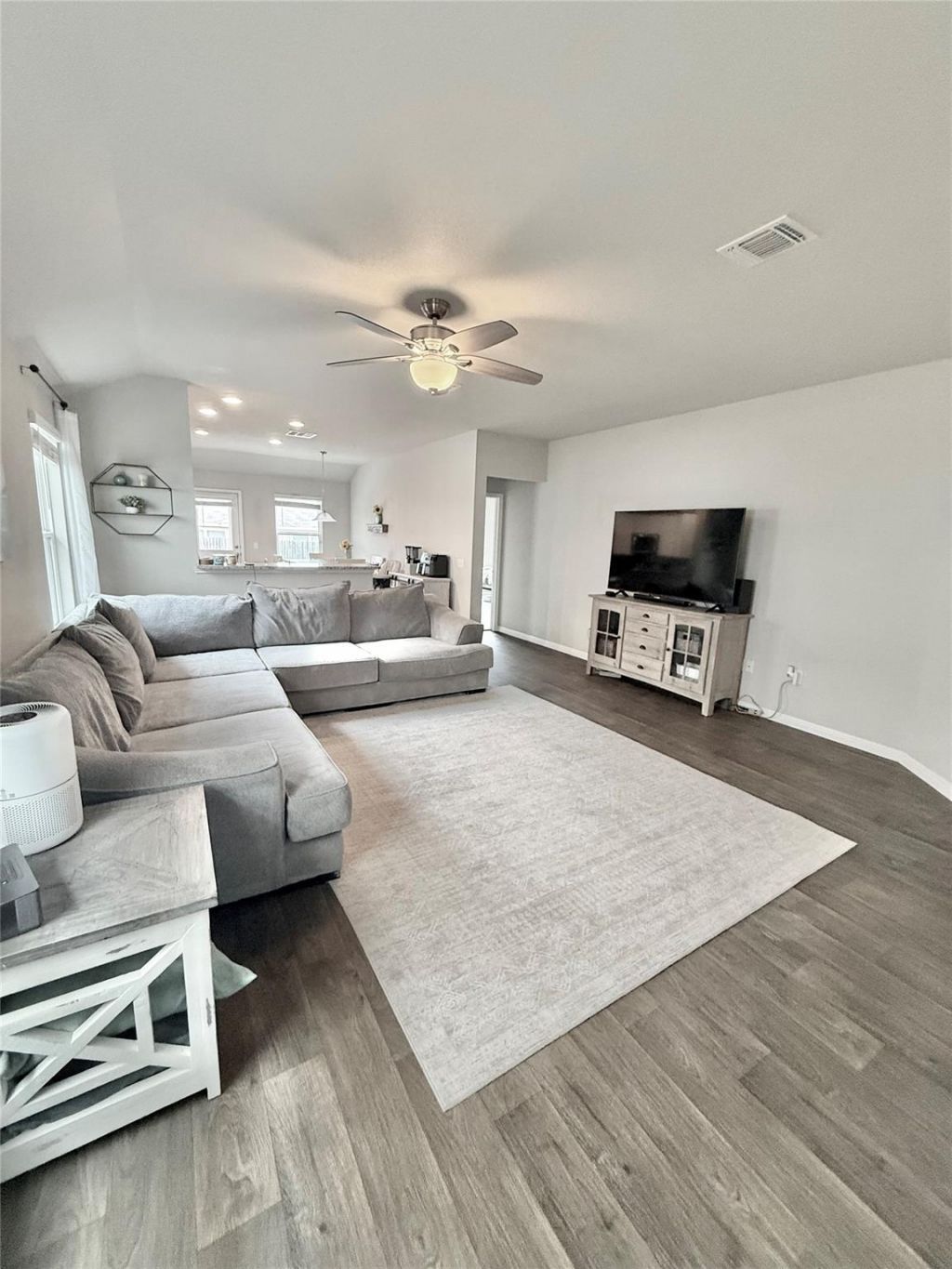 Lots to love about this home! When you enter through the front door, youre welcomed by a spacious open floor plan. The living room flows nicely into the kitchen, separated by a convenient breakfast bar. The large kitchen and dining area create a bright, open feel thats perfect for everyday living and entertaining. A rare feature of this home is the full-width concrete patio across the back, with one end covered?perfect for relaxing or hosting guests. The east-facing backyard provides morning sunshine and comfortable evening shade. Conveniently located just a short drive from one of the newest H-E-B stores, this home also comes with several great extras, including a washer, dryer, reverse osmosis system, water softener, garage door opener, and a sprinkler system.The neighborhood offers wonderful amenities such as a community pool and walking trails. Schedule your showing today and come see everything this home has to offer before its gone!
