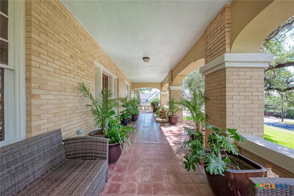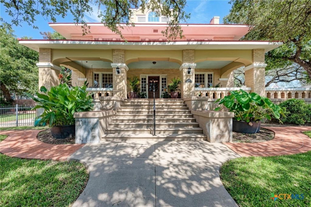 Situated on a prominent corner lot and framed by majestic heritage oaks, this exquisite and unique 1920 Craftsman-era residence is a standout among Lampasas' historical homes. The home has been meticulously and proudly restored, a true testament to luxurious living with its perfect blend of comfort and elegance. Spanning 4140 square feet, the main level welcomes you into a stunning foyer defined by rich, walnut-toned walls, coffered ceilings, a grand staircase, and elegant light fixtures. A sophisticated library with a fireplace is to your right, with a formal dining room to your left. The fully remodeled and updated kitchen is the heart of the home, featuring stainless steel appliances, granite countertops, and a fully restored and operational Chambers gas range. A sunroom and pantry extend from the kitchen, which also adjoins a cozy sitting room. The first floor includes one bedroom and one and a half bathrooms, while the unique double staircase leads to the second level, which houses four bedrooms and three full bathrooms. Unlike most historical homes, this property's 720 Sq ft basement is fully functional and well-lit, making it an ideal space for a hobbyist, wine collection, personal gym or game room. Additional lodging includes a 460-square-foot guest apartment located above the enclosed garage, providing a comfortable & charming space for visitors, complete with a full kitchen, full restroom, and plenty of natural light. The oversized patios, verandas, and covered porches further contribute to the home's remarkable character and appeal. Imagine yourself owning this impressive estate. Homes such as this are a rare find.