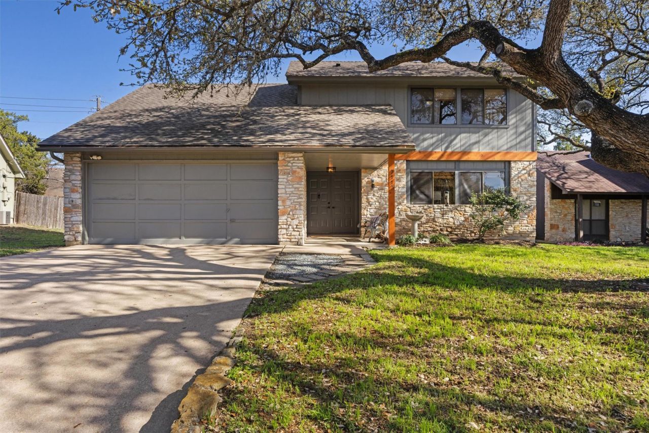 Classic 1977 South Austin charm meets everyday livability in this Beaconridge home, set off a wide, tree-lined street on a spacious lot. Offering 3 bedrooms, 2 bathrooms, and 1,558 square feet, the functional layout features a spacious living room with a towering stone fireplace and French doors opening to the back, a main-level bedroom or guest suite, and a semi-converted garage providing bonus space ideal for an office or studio, plus a utility room with a separate entrance (not included in square footage). Upstairs offers two additional bedrooms?one with treehouse-like views and the other with expanded space?connected by a shared Jack-and-Jill bath. The kitchen maintains its original footprint with updated appliances and overlooks the front yards prominent live oak tree. The backyard is built for entertaining and everyday enjoyment, complete with a covered patio, fire pit, cowboy pool with deck and lighting, outdoor movie screen, and a large fenced yard. Well maintained with key updates including interior paint (2023), HVAC (2022), electrical panel (2017), and solar panels (2019) on a 30-year roof (2016). Opportunity for cosmetic updates with strong bones and excellent potential to personalize and add value. Pre-inspected and priced accordingly; completed repairs, sellers disclosure, and inspection report available. Convenient South Austin location near South Congress and William Cannon with easy access to downtown, transit, shopping, dining, and entertainment?just minutes from local favorites The Little Darlin, Fortune Teller, and Sagebrush. Come see what South Austin living is all about!